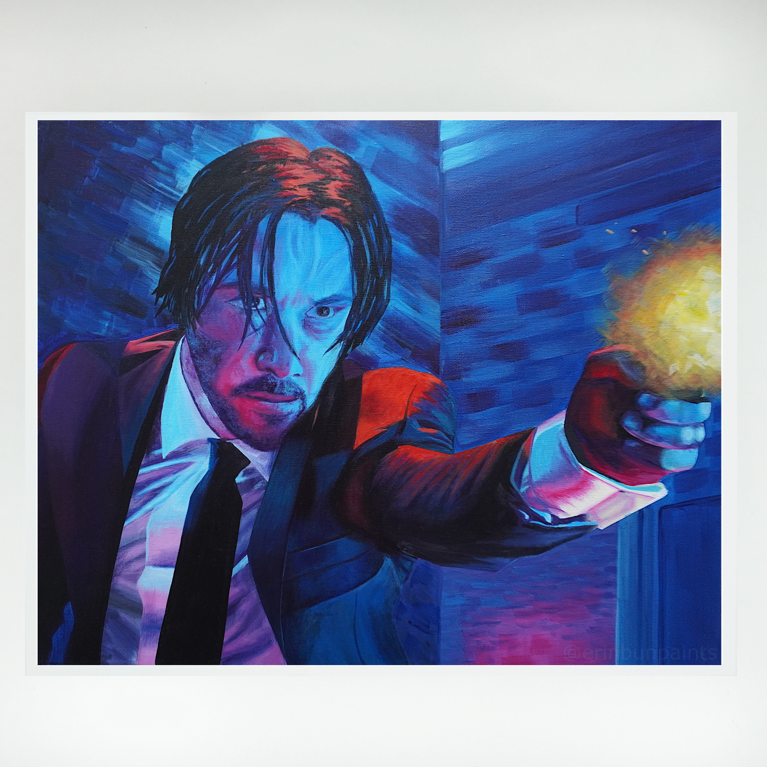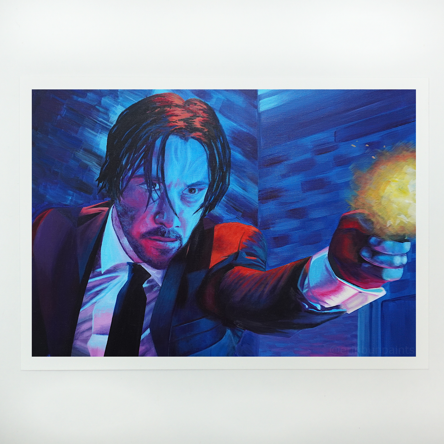 Love him or fear him, the original painting which this print displays was created using a still image from the original John Wick film, starring the beloved Keanu Reeves. It began on Keanu's 56th birthday and took multiple years of working in small spurts, spending extra care and time on the folds of the clothing and bright neon highlights, while leaving the facial features until the very end (those who watched me paint this live on Twitch will remember him as 'Keanuwu' due to his cursed 'uwu' placeholder face).