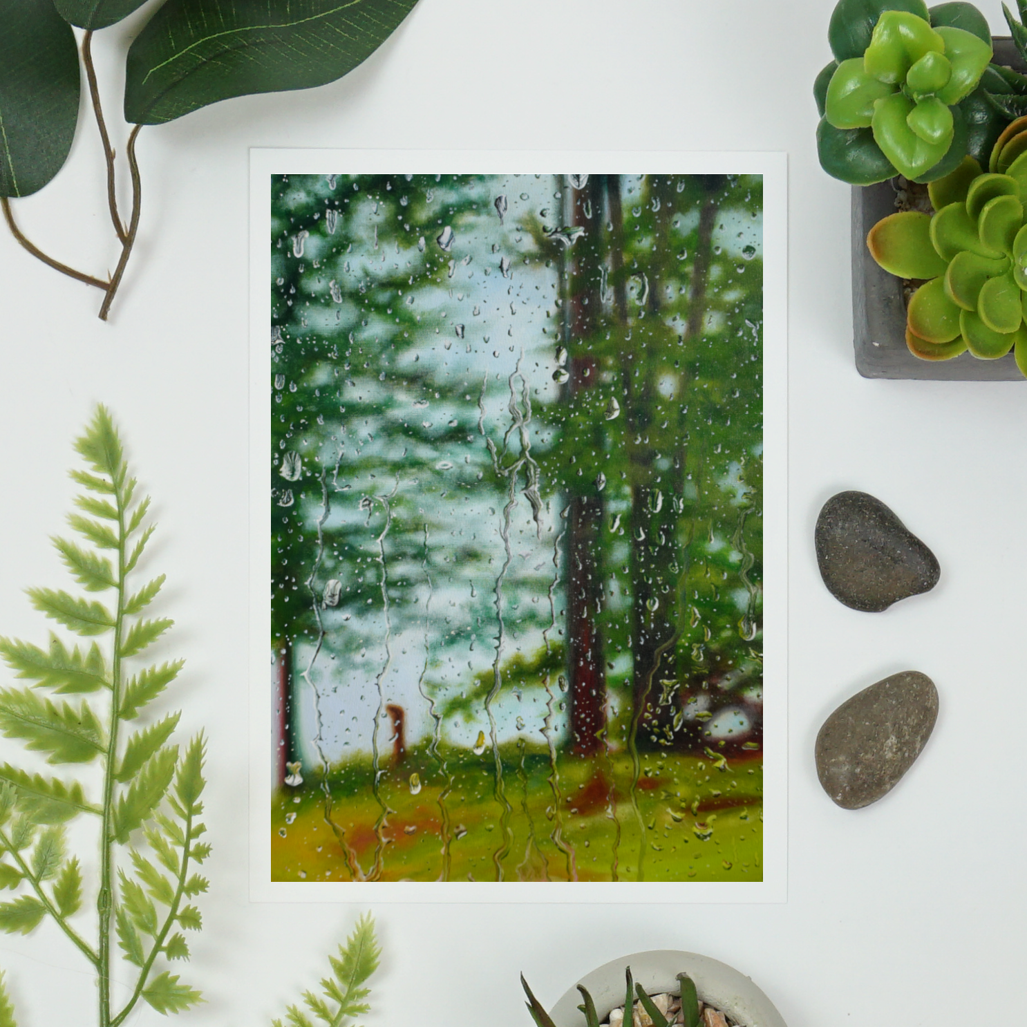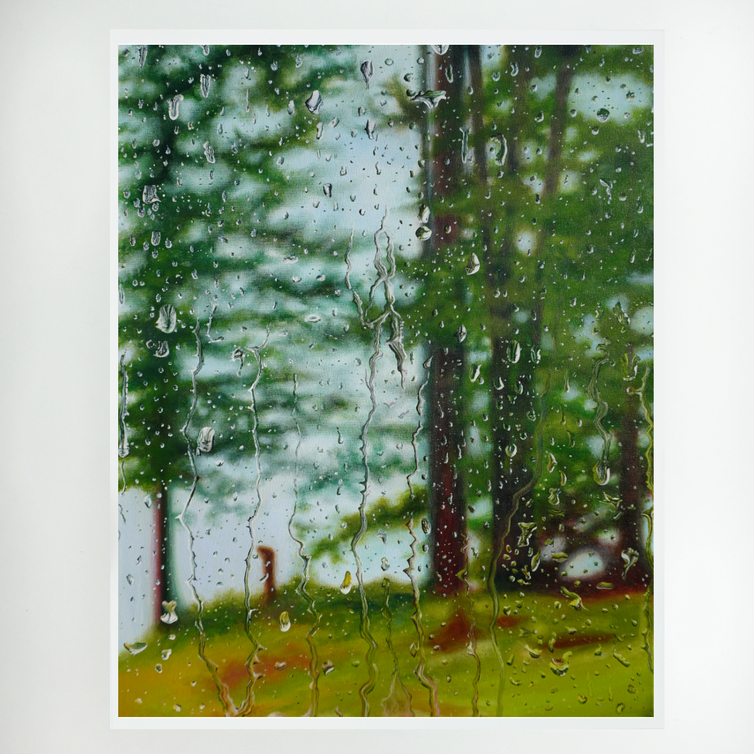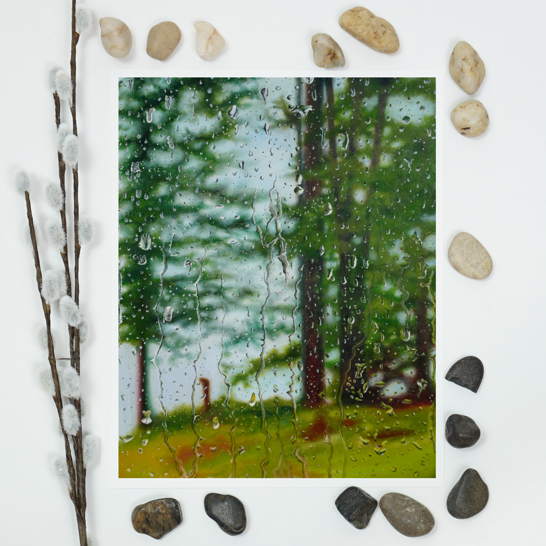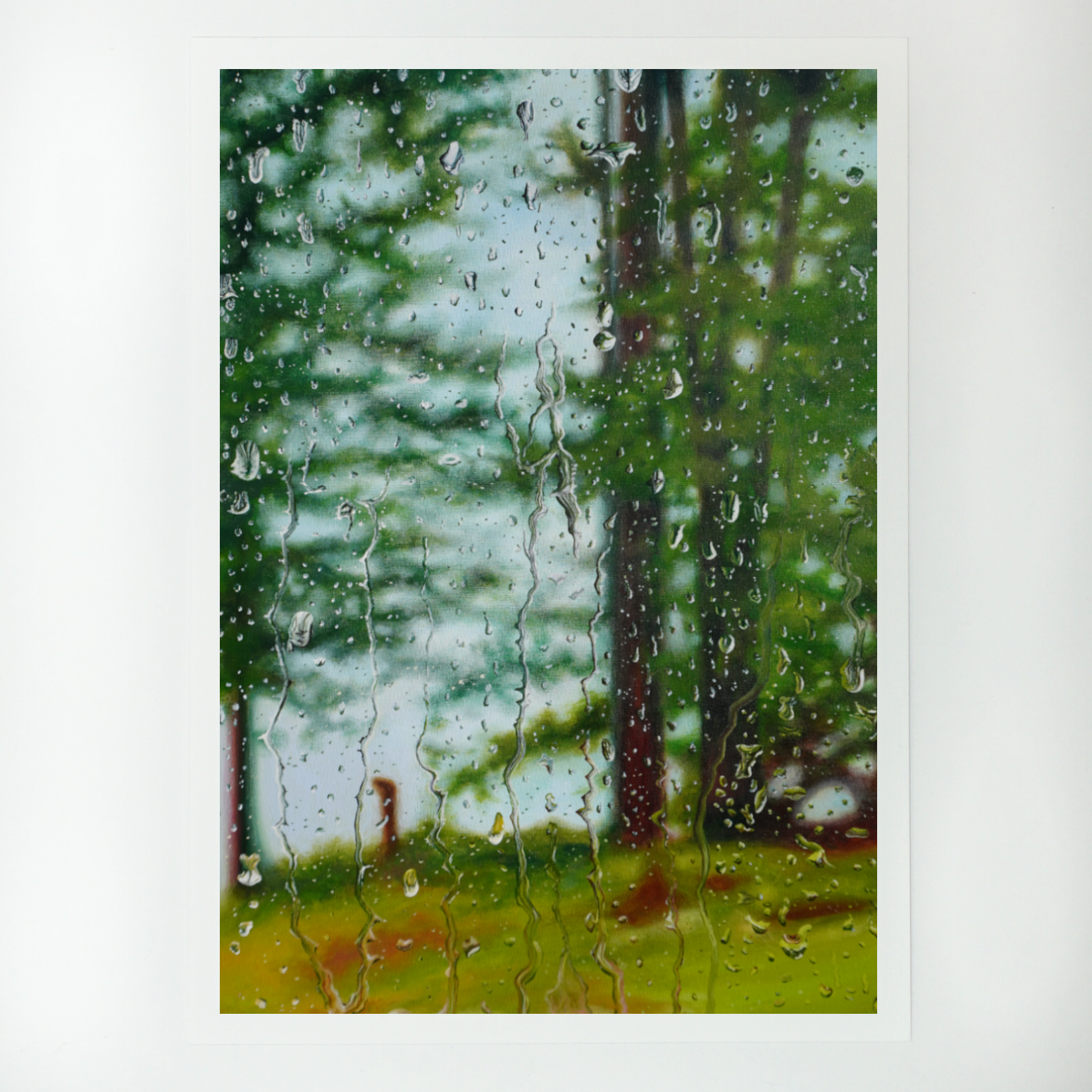 Painted from a personal photo reference taken in Haliburton, Ontario, this design is both deeply personal and widely familiar. Get lost in the endless detail contained in each raindrop, placing yourself somewhere calm and special to you.