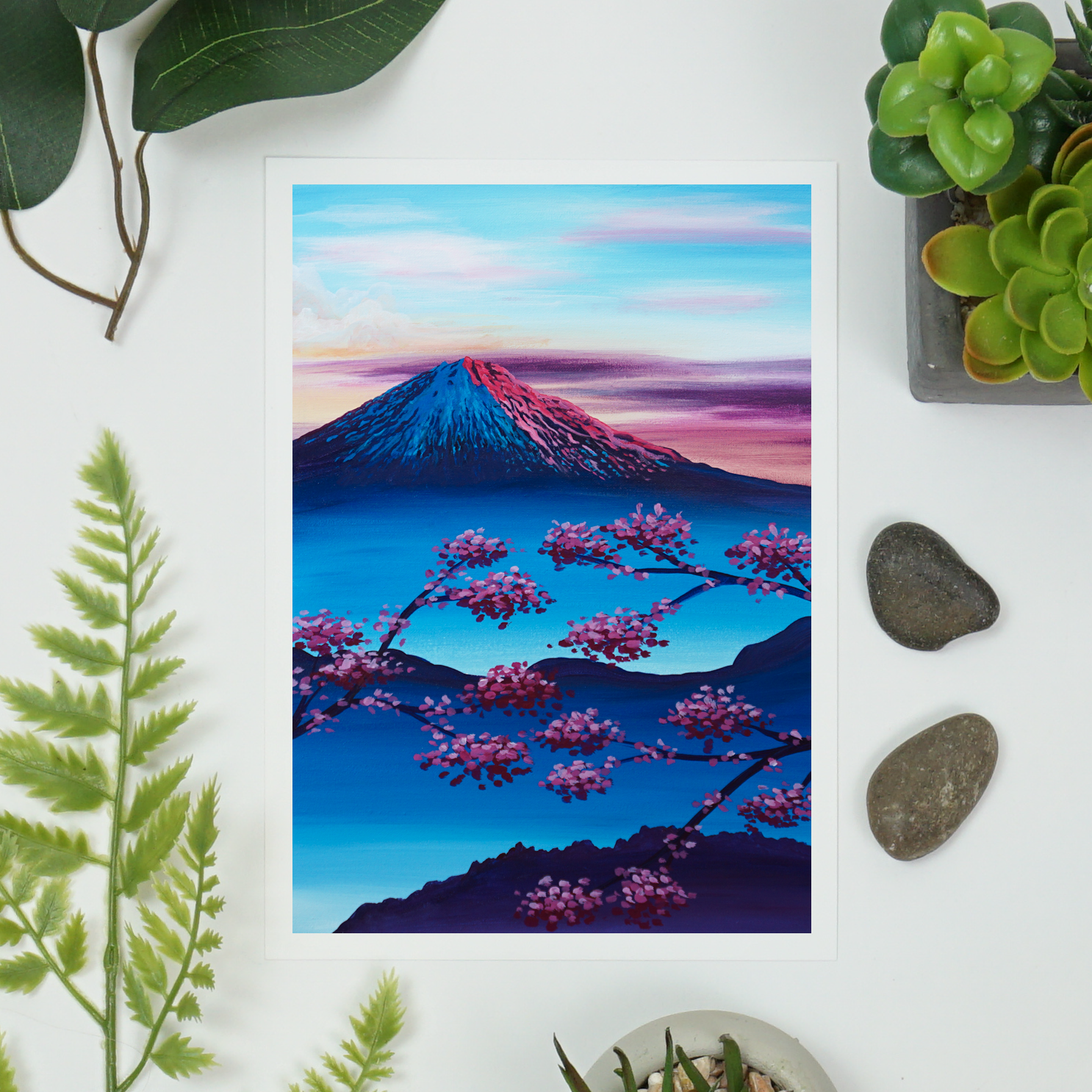 A showcase of the beautiful Mount Fuji and cherry blossoms in the foreground, featuring as many purples, blues, and berry tones as possible.