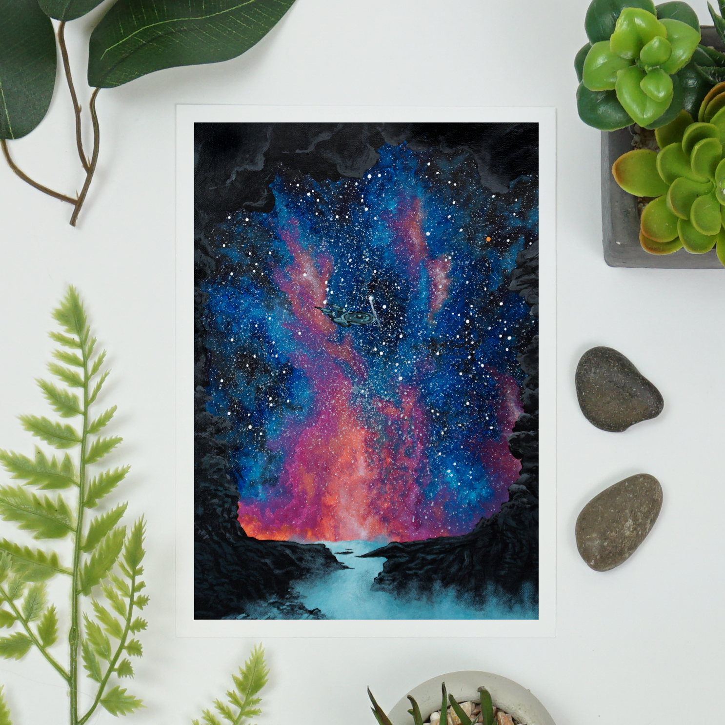 A view from inside a cave with misty waters and a galactic view. Look closely, what can you find in the sky?