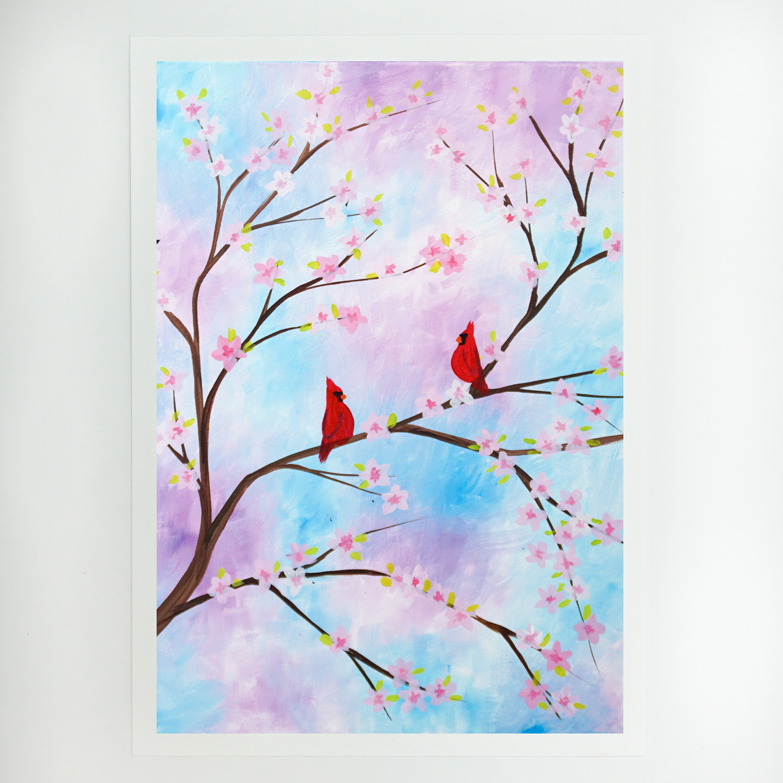 Vibrant spring colours with some cherry blossoms and cardinal friends - what could be better?