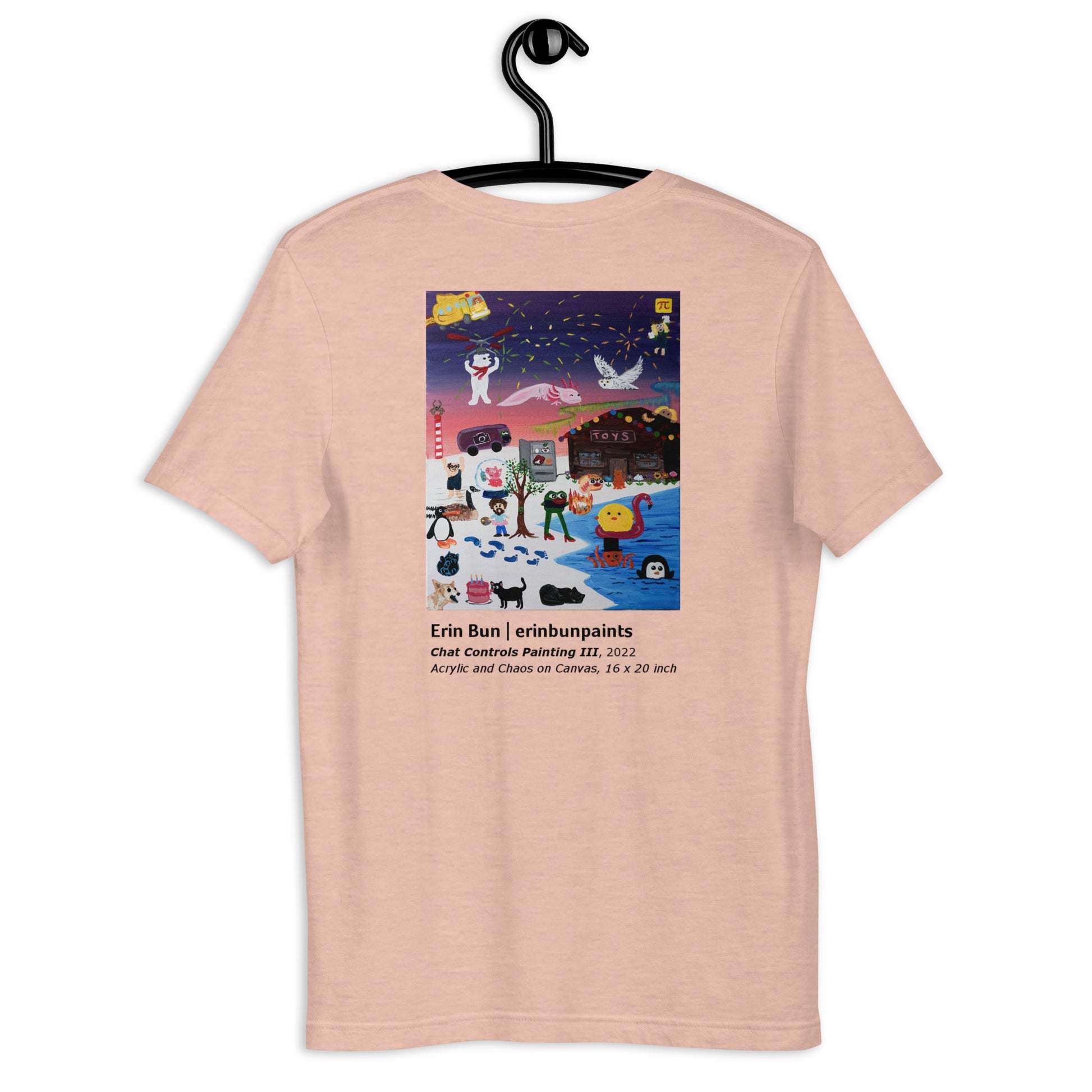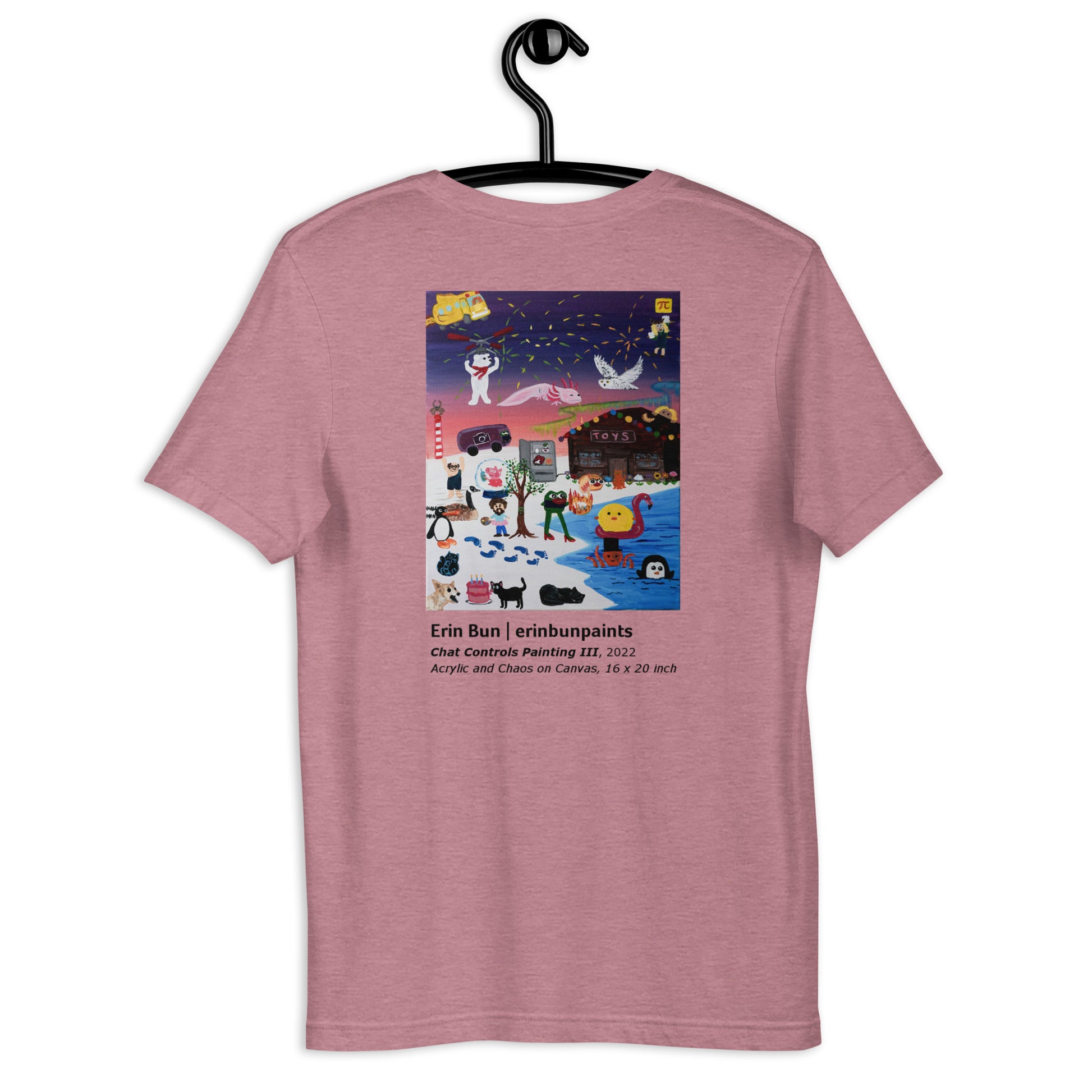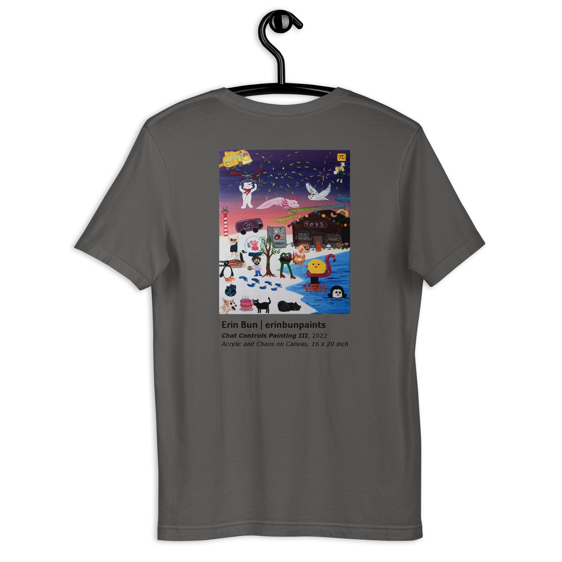The final 'Chat Controls Painting' piece is featured on the back of this shirt, and it's... incredible. The text below the image reads: